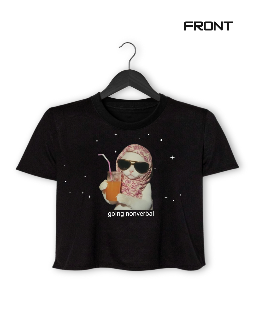When social battery hits 1%… this crop gets it 😎 Featuring an iconic cat in shades and a pashmina with the caption “going nonverbal,” this black tee is pure mood. Soft, cropped, and meme-worthy—perfect for your overstimulated era.