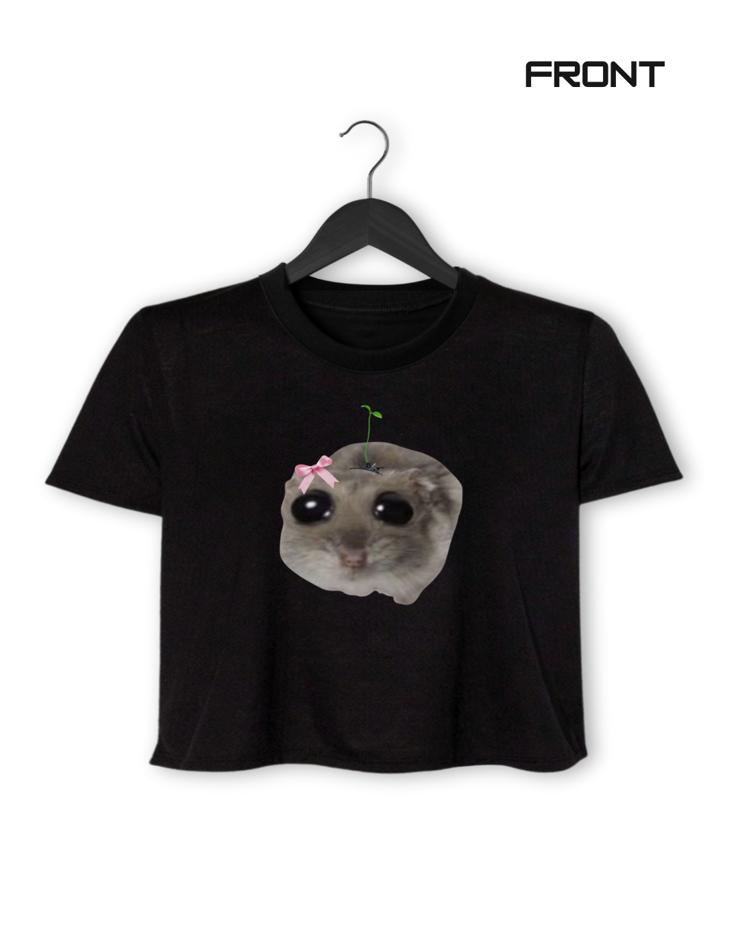 Embrace the emotional support rodent vibes 🌱 This black crop features a big-eyed baby hamster with a tiny sprout on its head—perfectly capturing your delicate mental state post-rave (or just mid-week). Cute, weird, and weirdly relatable 🙂