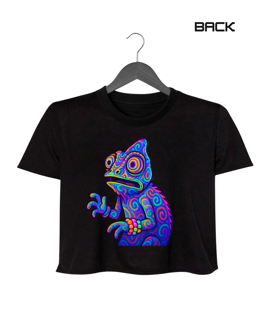 Match your color to your vibe with this cute, colorful "What color is the drop?" crop Tee! This black crop T-shirt features vibrant lettering with the question on the front and a psychedelic chameleon design on the back. This fun, pondering piece, with its colorful design, makes a standout choice for any festival, cuddle puddle, or to rep your unique vibe! 🌀✨